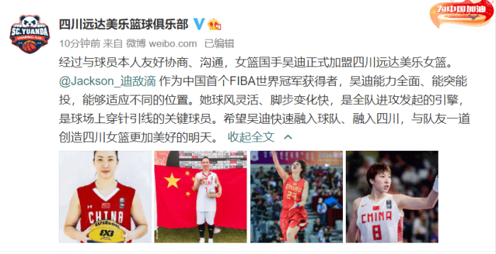 来源:JRS直播网08-30 11:37JRS直播网8月30日讯 ,WCBA四川远达美乐篮球队官方宣布韩旭和吴迪加盟,这个间歇期,她们已经连续签下了四名国手,整体实力大幅度提升,成为新赛季的争冠热门球队。