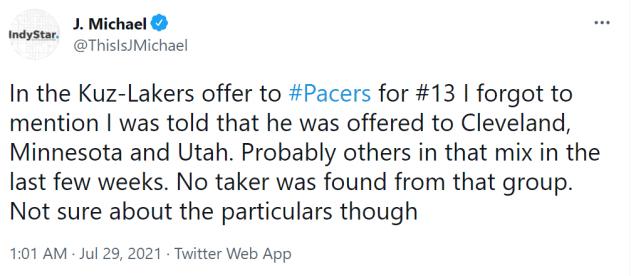 据步行者记者J.Michael报道,湖人同样用库兹马向骑士、森林狼和爵士报价,均遭到拒绝。而在昨日有消息称,湖人也尝试过用库兹马+22号签换步行者13号签,但也被拒绝了!只能说明库兹马目前的价值很低,对他感兴趣的球队很少。