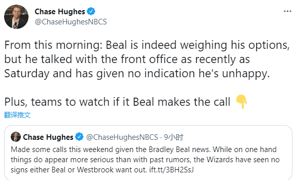 此前美记者爆料比尔正式衡量自己的未来,他有可能申请离队奇才;不过截止到目前,比尔并没有申请离队,名记Marc Spears报道,比尔想要终老在奇才,并且想要在奇才退役球衣。