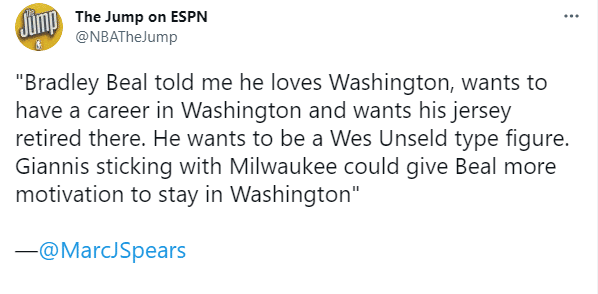 Marc Spears报道,比尔告诉我他喜欢华盛顿,想在华盛顿打完整个生涯,想要在奇才退役球衣;他想要成为韦斯-昂塞尔德(奇才传奇球星入选奈史密斯名人堂,41号球衣被奇才退役)那样的人物;名记还表示字母哥坚守在雄鹿给了比尔更多留在奇才的动力。
