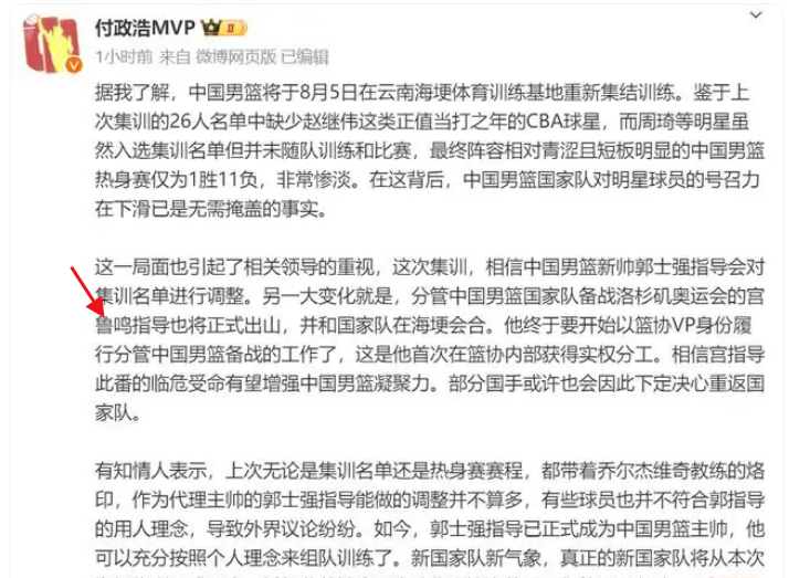 根据付政浩的报道,为了解决这个问题,分管中国篮球国家队备战洛杉矶的67岁名帅宫鲁鸣指导将正式出山,他将和国家队汇合。名记表示:宫鲁鸣将开始以篮协VP身份履行分管中国男篮备战工作,这也是宫鲁鸣首次在篮协内部获得实权分工,这也意味着宫鲁鸣将替代姚明成为中国男篮备战工作的直接领导。