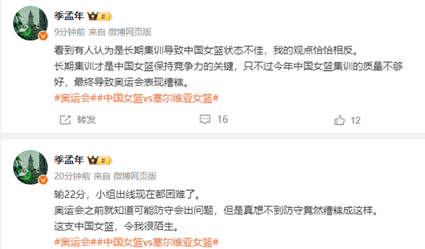 体坛周报记者季孟年更博道:输22分,小组出线现在都困难了。奥运会之前就知道可能防守会出问题,但是真想不到防守竟然糟糕成这样。这支中国女篮,令我很陌生。