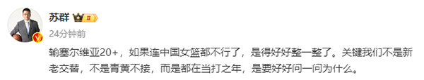 中国女篮22分惨败引热议,篮球评论员苏群发微博表示:输塞尔维亚20+,如果连中国女篮都不行了,是得好好整一整了。关键我们不是新老交替,不是青黄不接,而是都在当打之年,是要好好问一问为什么。