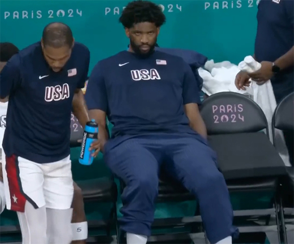 来源:JRS直播网08-01 13:23JRS直播网讯 北京时间8月1日,奥运男篮小组赛美国男篮击败南苏丹,两战全胜排名小组第一,美国男篮主动大变阵,不仅让塔图姆浓眉首发顶替霍乐迪恩比德,而且恩比德成为美国男篮全队唯一被弃用的球员,坐在替补席双手插兜,一脸不开心的样子。