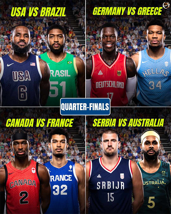 八强对阵出炉:美国队VS巴西队;德国队VS希腊队;加拿大队vs法国队和塞尔维亚队vs澳大利亚队;值得一提的是,四分之一决赛的4名胜者将晋级半决赛,第五到八名则由国际篮联官方篮球规则进行排名。