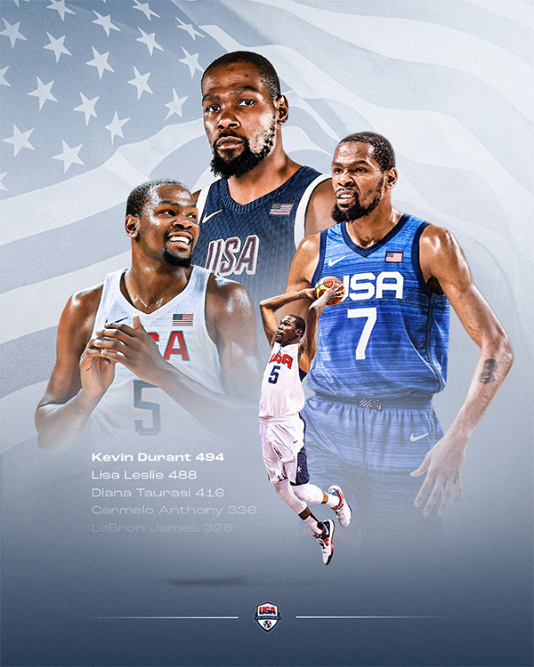 算上本场11分,杜兰特奥运生涯总得分达到494分,超越丽莎-莱斯利(488分)成为美国历史上奥运会篮球项目得分最多的球员。