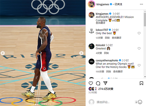 来源:JRS直播网08-12 12:17JRS直播网讯 北京时间8月12日,2024年巴黎奥运会正式落下帷幕,美国男篮夺得金牌并且创造奥运五连冠;詹姆斯更新社媒,晒出多张照片庆祝夺冠,配文写道:复仇者联盟,完成任务。