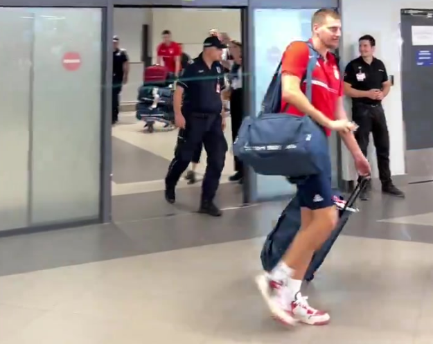 塞尔维亚男篮已经回国,在贝尔格莱德机场,约基奇等运动员都受到了接机球迷的热捧;走在最前的约基奇不断的向球迷招手。