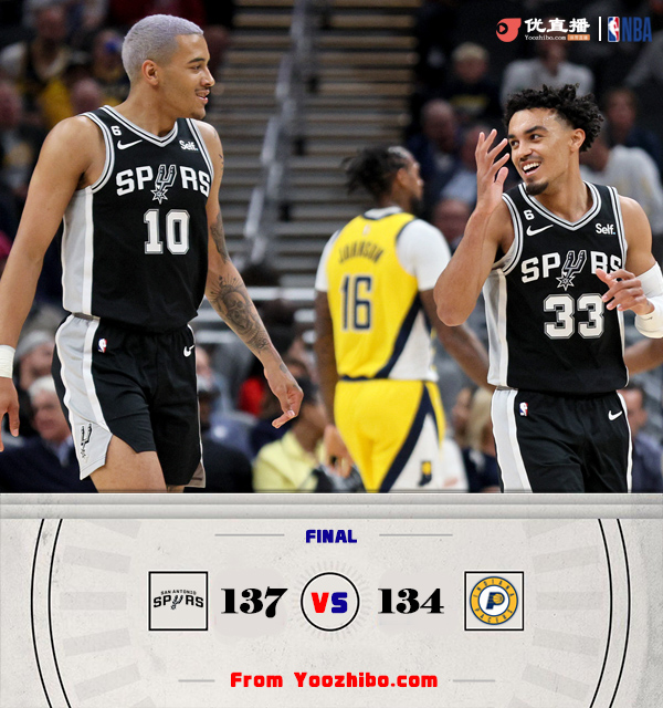 JRS直播网 10月22日讯 NBA常规赛,马刺客场挑战步行者。马刺夏天出售多名主力,想要文班亚马的心已是路人皆知。步行者这边仍待价而沽,等着湖人拿两个不受保护的首轮签来换希尔德和特纳。本场比赛,马刺自开场以后便全场领先,步行者一度将分差迫近到2分,但马刺持续发力曾将分差拉开到20分以上,步行者奋力再将分差缩小只剩1分,还一度使出砍珀尔特尔的战术犯规,但马刺顶住了对手的反扑,力克步行者。