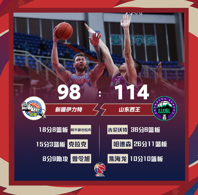 JRS直播网4月11日讯 CBA常规赛倒数第二轮,新疆与山东侠路相逢,目前新疆已经锁定常规赛第四名,山东则暂列第五,此役高诗岩因伤缺阵。首节两队均是内外结合,比分也始终紧咬,但新疆老大难的罚球问题还是让他们处于追赶者的角色,次节周琦因为身体原因被迫下场,新疆的进攻几次断电,山东则是多点开花很快就确立了两位数的领先优势。第三节山东在哈德森的带领下下起一阵三分雨,单节八记三分射得新疆晕头转向,节末一波8-0的攻击波后更是将分差扩大到24分,末节新疆一度送出10-0的攻势看到了追平的希望,但吉伦沃特单节爆砍17分彻底杀死比赛悬念,最终山东114-98击败新疆,取得三连胜的同时也送给对手三连败。