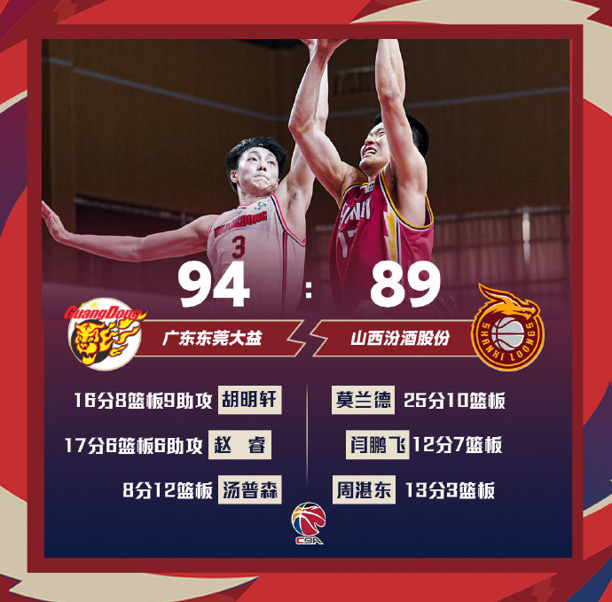 山西:莫兰德25分10篮板3助攻2盖帽、周湛东13分3篮板3助攻2抢断、闫鹏飞12分7篮板3盖帽、张旭9分4篮板3助攻3抢断、刘冠岑8分3篮板2助攻、葛昭宝8分、张宁6分4篮板、陈彭宇迪5分5篮板3抢断2助攻、张泽龙3分
