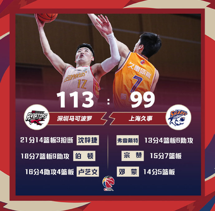 JRS直播网4月5日讯 今日CBA常规赛,深圳迎战上海。深圳排名积分榜第8,上海最近遭遇两连败,22胜27负排名积分榜第13。比赛开始,上海首先发力取得6分领先,随后于梁里突外投连续拿分替深圳缩小分差,首节结束时,上海23-22仅领先深圳1分。次节上来,双方比分依旧胶着,上海抓住深圳失误一度领先5分,深圳快速调整后始终紧咬比分不放。易边再战,卢艺文外线爆发连中3记三分,上海进攻效率降低,深圳不断扩大领先优势,三节结束,深圳84-74领先上海10分。末节上来,上海打出一波8-3将分差缩小至只剩5分,但之后深圳里突外投接连得手,一度将分差扩大至16分,比赛随即失去悬念。最终,深圳113-99战胜上海。