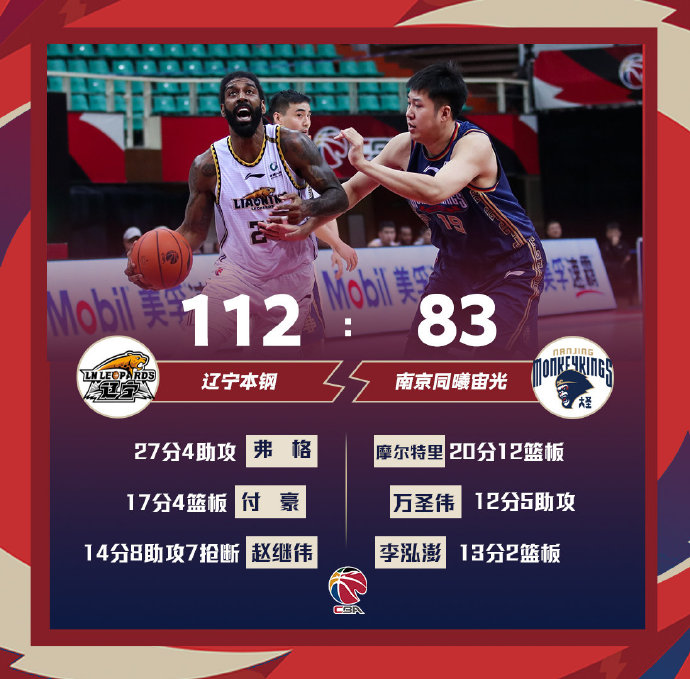 辽宁(41-9):弗格27分4篮板4助攻2抢断、梅奥20分3篮板4助攻3抢断、韩德君16分6篮板、赵继伟14分4篮板8助攻7抢断、朱荣振10分8篮板2助攻3盖帽、付豪17分4篮板、吴昌泽3分6篮板。