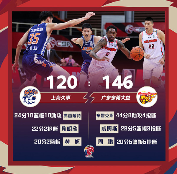上海(14-19):弗雷戴特34分10篮板10助攻4抢断,鞠明欣22分2抢断2封盖,刘铮17分6篮板3助攻,黄旭20分2篮板,区俊炫9分3篮板,何重达4分6篮板3助攻,施宇晨8分2篮板3助攻。