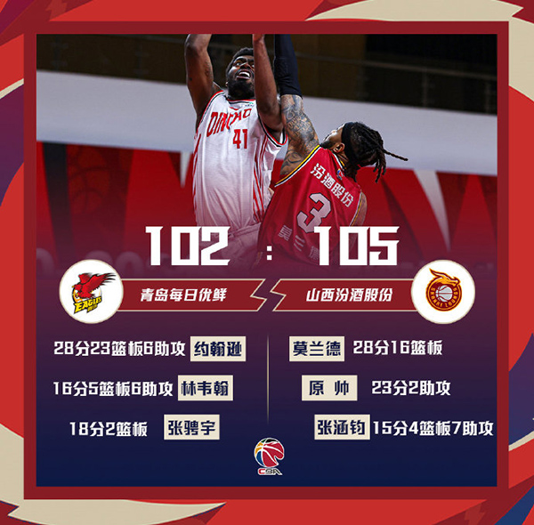JRS直播网1月1日讯 CBA常规赛,青岛今日迎战山西,前者遭遇两连败暂列积分榜第六位,而后者上场比赛则是输给了辽宁排名联赛第十位,本场亚当斯和富兰克林均缺战。比赛上来两队都进入状态较慢,频频打铁失误,在经过调整后青岛开始发力,一波攻势取得领先,次节双方依旧没能解决好进攻端的问题,半场结束时山西将分差缩小到4分。易边再战,山西继续反扑成功实现反超,末节更是将分差拉大到两位数,青岛此后再度迫近比分,张涵钧绝杀球被封盖,比赛进入加时,加时赛场上依旧保持拉锯,关键时刻葛昭宝两罚全中,张骋宇绝平球不中,最终山西加时险胜青岛,送给后者三连败。