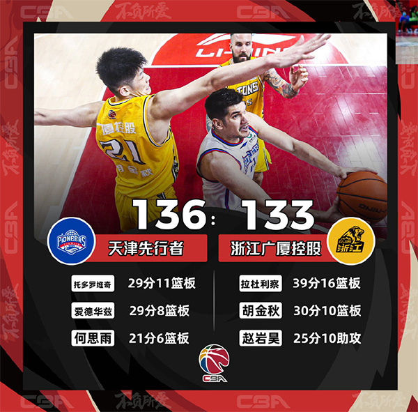 JRS直播网12月26日讯 CBA常规赛第23轮比赛继续进行,近期四连败的广厦迎战联盟垫底的天津,上轮两次技犯的胡金秋申诉成功首发出战,孙铭徽则因伤继续缺席,首节上来两队外线早早开张,赵岩昊状态火热独得12分,托多罗维奇则率队及时回应,首节结束时两队战成32平,次节比赛中托多罗维奇肆虐内线,单节独得13分的他半场结束已经轰下24分,天津带着2分优势进入中场休息。易边再战后两队继续火热对攻,爱德华兹中段连得9分,拉杜利察则单节砍下20分,三节结束时天津依然领先3分,末节回来广厦一波10-0成功反超,天津连中三分抹平分差,拉杜利察被吹违体犯规后天津连中罚球,但赵岩昊关键跳投打进,爱德华兹失误后大帽拉杜利察,两队常规时间打平进入加时。加时赛中,两队你来我往继续紧咬,爱德华兹关键时刻连续取分,广厦回天乏术,最终天津136-133险胜广厦。