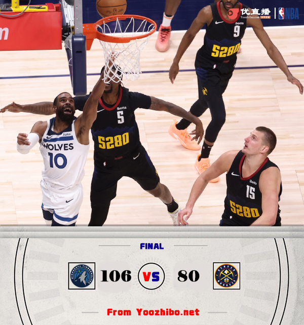 JRS直播网5月7日讯 掘金今日坐镇主场迎来和森林狼西部半决赛的G2之战,上一场森林狼先拔头筹抢到主场优势,不过本场对决森林狼内线防守大闸戈贝尔因个人情况缺席比赛。森林狼虽然缺少戈贝尔但首节表现依旧不差,尤其是在限制约基奇上下足功夫,后者首节虽然拿到4分4助但也出现3次失误;森林狼方面唐斯势不可挡单节6投5中拿到11分并为球队确立起领先;次节唐斯带队延续状态再添5分,加上新科最佳第六人里德和沃克联手命中3记三分,森林狼开局送出14-2的攻势直接拉开20分的分差;掘金这边约基奇被完全限制半场仅得8分,而外线核心穆雷受困伤病更是10投1中仅得到2分,整个上半场森林狼可以说完全压制掘金并拿到26分的领先优势。下半场归来森林狼牢牢掌控局面分差也一度拉大至30分,虽然掘金也在随后及时止血止住颓势,但场面完全落入被动,森林狼一直保持着20分左右的优势直到最后。最终,森林狼客场轻取掘金连下两城,总比分上2-0取得领先。