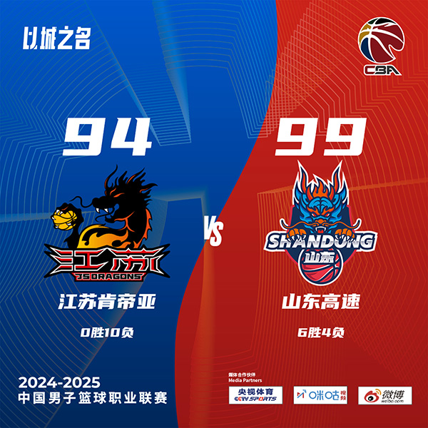 JRS直播网11月3日讯 CBA常规赛首阶段收官战,江苏主场迎战山东,开赛至今江苏苦吞9连败,是目前联盟唯一不胜球队,山东上场力克北控,目前5胜4负排在联赛第10位。此役开打后双方陷入缠斗,山东双外援克里斯和盖利联手取分,蒋浩然连投带罚强势回应,末段江苏开始发力后来居上,首节结束时江苏领先2分,次节回来,双方进攻均陷入停滞,两队单节得分均未超过20分,蒋浩然联手崔晓龙率队保持优势,半场战罢,江苏依然领先1分。易边再战后江苏外援特奎维恩-史密斯突然爆发,单节飚中4记三分狂砍21分,末段场上形势风云突变,山东回敬11-2攻击波夺回优势,三节结束后山东反超1分,末节决战,两队你来我往交替领先,决胜时刻高诗岩造杀伤罚球拿到本场首分,江苏追分未果,陈培东联手盖利终结悬念,最终山东99-94击败江苏送对手开局10连败。