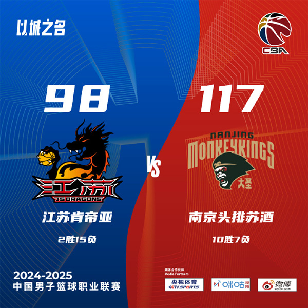 JRS直播网讯2024年12月14日讯 CBA常规赛,江苏和同曦迎来德比。江苏目前2胜14负,同曦9胜7负。一开场,双方势均力敌,比分始终紧咬,江苏不断冲击内线频频得手,同曦内外开花迅速回应,次节同曦占得先机,此后却突然哑火,江苏轰出17-0强势反超,郭昊文高效发挥带队追赶,半场战罢双方战成60平。下半场,郭昊文延续火力,得分助攻一肩挑带队将分差拉开到两位数,末节林葳连中三分将分差拉开到20分,江苏大势已去无力回天。最终,同曦117-98击败江苏,赢下德比。