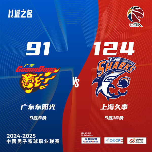 JRS直播网讯2024年12月14日讯 CBA常规赛,广东今日迎战上海,前者近来取得两连胜,后者则是三连胜,并且三场赢了101分。比赛上来,广东率先进入状态打出7-0的完美开局,但上海此后及时调整追了回来,首节后半段广东更是陷入到得分荒,上海轰出一波11-0取得领先,次节广东的情况依旧没有好转,除了徐杰和吉伦沃特其他人难有发挥,分差也是被扩大到二十分以上,半场结束时上海领先19分;下半场回来,广东的命中率有所提升,但依旧无法限制对手的攻势,上海连续第三节单节得分破30分,分差也是一直保持在二十分左右,比赛在末节早已失去悬念,最终上海大胜广东迎来四连胜。