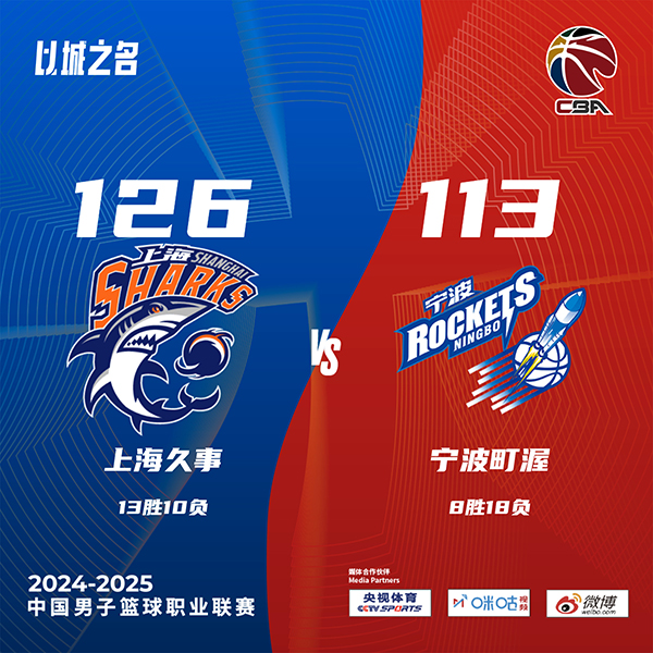 JRS直播网讯北京时间1月4日讯 CBA常规赛,上海主场迎战宁波,上海目前11连胜,12胜10负升至积分榜第13位,宁波则是8胜17负排在第15位。比赛开始,双方迅速进入状态,王哲林接连内线强打得分上双,而宁波则是靠外援撑起球队进攻,还命中很多高难度进球,首节上海领先4分,次节上海7-0后一度领先到双位数,随后宁波持续发力回应14-3攻击波反超比分,随后上海再回应11-2小高潮半场领先6分。下半场,双方展开拉锯战,李弘权里突外投连砍8分,上海顺势打出16-1超级攻击波拉开双位数领先,宁波接连三分止血追分,三节上海领先2分,末节李弘权又是接连三分,上海一波12-2重新拉开双位数领先,随后上海牢牢掌握住双位数领先,最终上海126-113力克宁波,豪取12连胜。