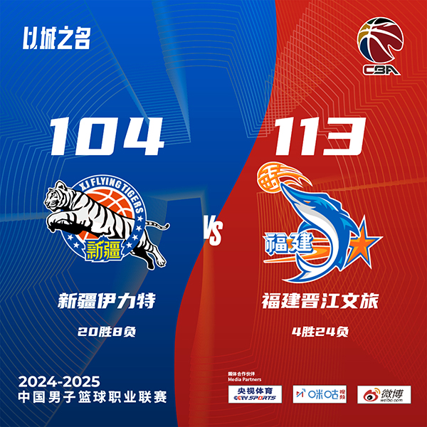 JRS直播网讯北京时间1月10日讯 CBA常规赛,新疆主场迎战福建。新疆20胜7负排在联赛第四,福建3胜24负垫底。一开场,齐麟高效输出,邹阳内外开花还以颜色,次节皮特森连中三分将分差拉开到两位数,福建多点开花迫近比分,路易斯-金三分一度反超,新疆三分3连击打出12-3以63-57领先结束上半场,下半场,双方继续缠斗,比分始终紧咬,曾凌铉连中三分带队反超,末节福建稳扎稳打保持优势,新疆连投带罚苦苦追赶无果。最终,新疆爆冷主场104-113不敌福建。