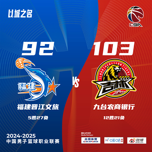 JRS直播网讯 北京时间1月20日讯 CBA常规赛继续进行,福建主场迎战吉林,吉林近期遭遇连败,目前11胜21负暂列联赛第15位,福建上场不敌广东,5胜26负联赛垫底。此役一上来双方便陷入缠斗,约瑟夫-杨和邹阳联手取分,琼斯盘活全队强势回应,两队你来我往比分紧咬,首节结束时福建领先2分,次节回来,双方继续鏖战,路易斯-金突然发力单节贡献12分,琼斯和基兹林克接连回应,半场战罢,福建依然领先2分。短暂休整后福建一波8-0一度拉开比分,吉林及时回暖连中三分,三节结束后吉林反超1分,末节决战,福建进攻滞涩,琼斯予取予求率队奠定胜势,福建追分无望,最终吉林103-92力克对手。