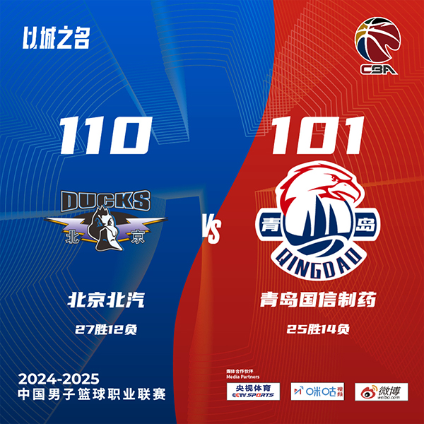 JRS直播网讯北京时间3月12日讯 CBA常规赛,北京对阵青岛。北京6连胜,26胜12负高居联赛第3,青岛25胜13负排在联赛第8,本场杨瀚森缺阵。比赛开始,双方开场便陷入缠斗,比分咬得很紧,曾凡博攻防两端发力带队打出10-2的攻击波取得领先,次节双方围绕10分左右分差展开拉锯战,周琦和曾凡博联手拿分,但青岛连中三分抹平分差,半场战罢双方战成55平。易边再战,两端依旧打得难解难分,鲍威尔突然发力连得13分带队取得领先,末节北京持续发力夺回优势,青岛苦苦追赶无果。最终,北京110-101力克青岛,取得七连胜。