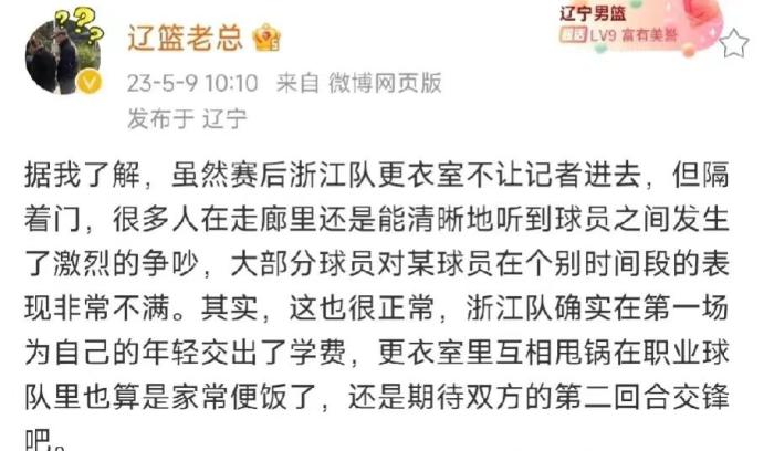 在总决赛G1后,“辽篮老总”爆料:“据我了解,虽然赛后浙江队更衣室不让记者进去,但隔着门,很多人在走廊里还是能够清晰的听到球员之间发生了激烈的争吵,大部分球员对某个球员在个别时段的表现非常不满。”