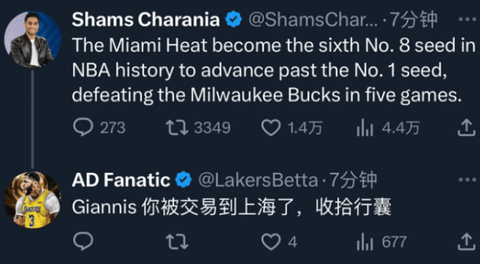 字母哥率领常规赛联盟第一的雄鹿遇到热火,被对手4-1掀翻,成为黑八背景板。当G5出局之战,字母哥罚球不中、关键时刻不敢出手导致雄鹿被淘汰,无数人抨击他太软,甚至还有美国球迷表示:“扬尼斯,你被交易到上海了,现在收拾行囊就离开”。