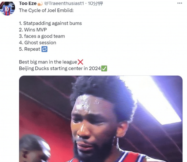 所以赛后有美国球迷吐槽恩比德,称:恩比德明年去北京队打球吧。