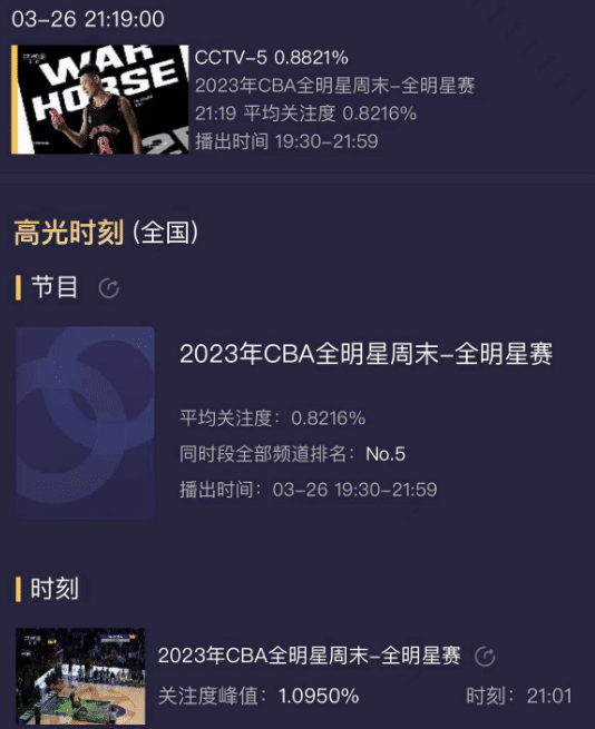 CBA全明星电视台是有直播的,根据数据显示,CBA全明星的平均收视率突破0.8%,最高时刻的收视率突破1%,同时间段排名全国第五,联想到是周末的黄金时间段,能够有这样的数据确实很不容易。