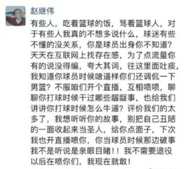 赵继伟还还击:我指导你球员时候啥X样你们还调侃一下男篮?不服咱们开个直播,互相喷喷,聊聊你打球时候干过哪些龌龊事,也给我们讲讲你打球的时候多牛X ?别把自己丑陋一面收起来当圣人,给你点面子,下次我也开直播喷你,你当球员的时候那破事,我不是听说是亲眼目睹,我不要退役以后在喷你们,我现在就敢。