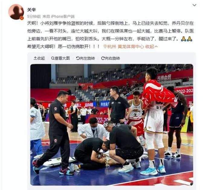 当时场上的球员和裁判都没有发现大碍,和刘雁宇对抗的乔丹贝尔和媒体席的记者先是发现了情况不对,裁判吹停了比赛,此时的刘雁宇已经失去了知觉,场上发生的一幕也是揪动着无数人心,场边的美女球迷更是双手祈祷直接落泪,见惯了大风大浪的杨鸣指导也是双眼泛红,和刘雁宇对抗的乔丹贝尔更是抱着头不敢相信这一幕。