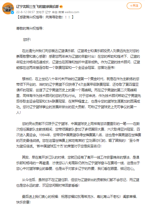 辽篮表示蒋兴权对辽宁篮球事业的发展所做出的巨大贡献,可称辽宁篮球史上无可争议的第一人。表示不会忘记对于辽篮的贡献,有时间常回家看看。最后辽篮送上衷心的祝福:祝愿您福如东海常流水,寿比南山不老松!阖家幸福,快乐安康!