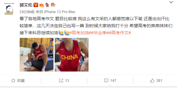 辽篮后卫、中国男篮球员郭艾伦一直都紧跟社会热点,他在看到了全国高考作文之后,也感慨太难了,同时表态自己会写一篇请网友打分,称:“看了各地高考作文 题目比较难 我这么有文采的人都感觉难以下笔 还是出出汗比较简单…这几天决定自己也写一篇 到时候大家给我打个分 希望高考的弟弟妹妹们接下来科目继续加油”