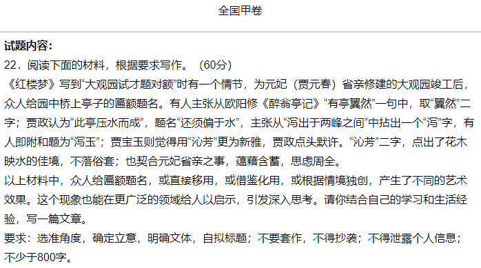 来源:JRS直播网06-07 14:40JRS直播网06月07日讯,高考作文出炉,这其中有我们非常熟悉的题材,比如“全国乙卷”的北京双奥之城,2008年北京奥运会和2022年北京冬奥会的题材,当然也有令人感到头疼的题材,目前在网络上最火的就是“全国甲卷”的红楼梦题材,指的是大观园竣工众人给园中桥上亭子的匾额题名的事情,根据这个材料,写一篇不少于800字的作文,几乎公认的今年高考作文最难的一个题材。