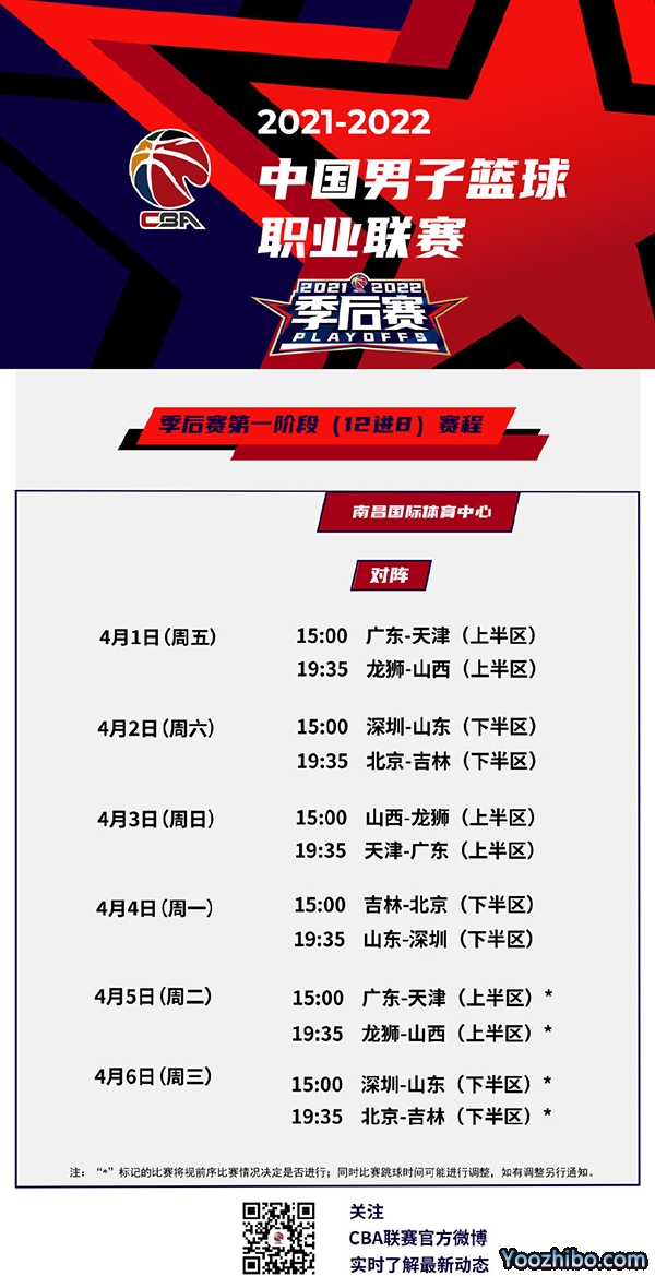 第二阶段(四分之一决赛):4月7-12日,采用三战二胜制,胜者进入季后赛第三阶段比赛;