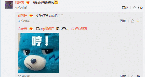 高诗岩的留言被胡明轩回应:“少吃点吧 减减肥得了”