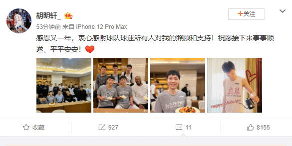 很快胡明轩在社交媒体上晒出了庆生的照片,同时配文:“感恩又一年,衷心感谢球队球迷所有人对我的照顾和支持!祝愿接下来事事顺遂、平平安安!”