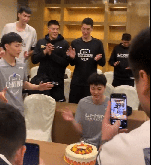 照片中教练杜锋、老大哥易建联都陪伴着胡明轩,蛋糕摆在寿星的面前。昨天复出但伤退的赵睿在身后,还有汤杰等人。