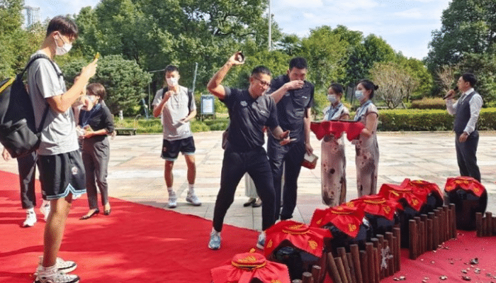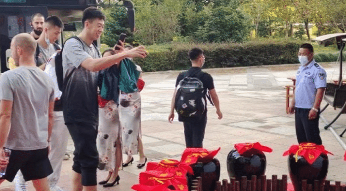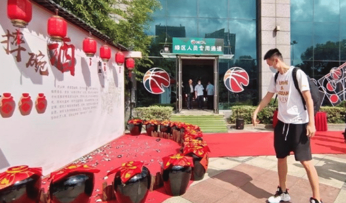 除了球员们的快递包裹之外,还有赛区给球员们准备的欢迎酒,这是诸暨当地为CBA球员准备摔碗酒,非常豪迈。这是抵达赛区之后,门口前上面写着“忠于所爱,欢迎回家”,新赛季CBA的口号为“忠于所爱”。在古代,摔碗酒是军队的壮行酒,上阵杀敌之前,士兵们豪饮一碗酒,把碗重重的摔碎,表示破釜沉舟的气势,豪气十足。