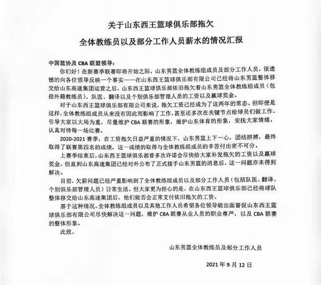 相较之下山东就比较寒酸了,虽然上赛季杀入四强,但新赛季丁彦雨航体测没通过能否打上比赛未知,球队出现欠薪的丑闻,多位球员和工作人员签字发出了讨薪求助信,希望能尽快拿到钱。媒体人“江南的城”爆料哈德森目前赢球奖+工资加起来有300多万都没到账,真是尴尬,可能俱乐部的资产情况出现了一些问题吧!