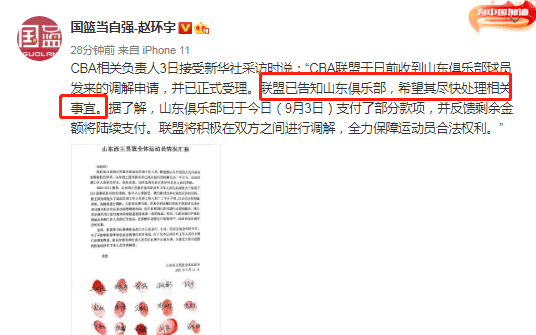 据赵环宇透露,CBA相关负责人在接受新华社采访时已经给出了态度,已经收到山东队球员发来的调解申请,而且正式受理。而CBA联盟也已经告知山东俱乐部,希望能尽快处理此事。据悉,山东队已经在昨天支付了部分球员薪资和奖金,而且会陆续支付剩余的费用,而联盟将积极进行调解,保障运动员的权益。