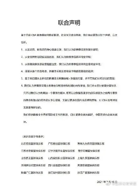 不过现在某些老总应该会充当反对赛会制急先锋,据此前的报道,绝大多数俱乐部认为宁可联赛先停摆也要恢复主客场制,哪怕赛程缩短也要坚决打主客场制。态度很强硬,大方向是中国篮协定,但具体如何实施还得看CBA各大股东,目前已经有15家俱乐部联名签署了希望新赛季恢复主客场的声明书。