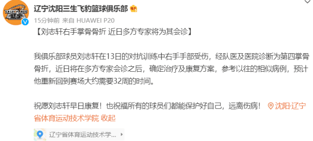 辽篮官方写道:“我俱乐部球员刘志轩在13日的对抗训练中右手手部受伤,经队医及医院诊断为第四掌骨骨折,近日将在多方专家会诊之后,确定治疗及康复方案,参考以往的相似病例,预计他重新回到赛场大约需要32周的时间。”