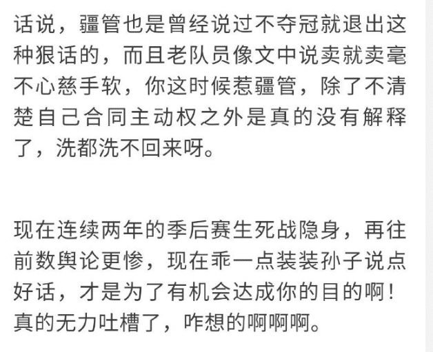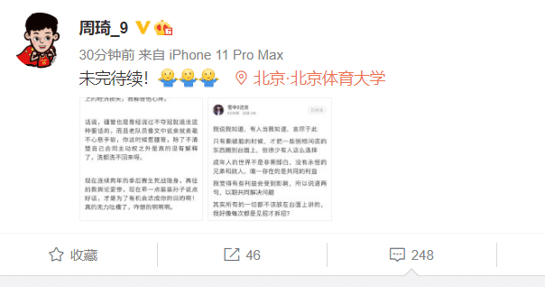周琦虽然没有明确表达对于新疆的不满,但转发这一动作,已经证实了这一点。早前,周琦曾在全运会比赛后,隐晦地炮轰了新疆管理层一次。而且在回复网友时,公开抨击新疆管理层不作为乱作为。