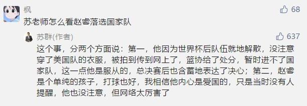 一向敢说的国内名嘴苏群在个人公众号中与球迷互动,他表示“这个事,分两个方面说:第一,他因为世界杯后队伍就地解散,没注意穿了美国队的衣服,被拍到传到网上了,篮协给了处分,暂时进不了国家队,这一点他是服从的,总决赛后也含蓄地表达了决心;第二,赵睿是个单纯的孩子,打球也好,我相信他内心是爱国的,只是当时没有人提醒,他也没注意,但网络太厉害了。”