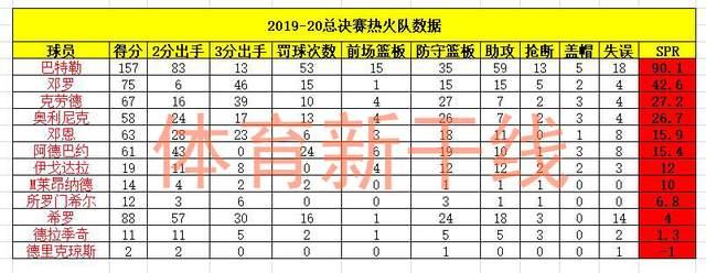 而值得一提的是,作为湖人队对手,热火全队SPR值最高的则是巴特勒,他的SPR值达到90.1,这个数据甚至超过了詹姆斯,所以,如果去年热火夺冠,巴特勒将是无可争议的FMVP获得者,而热火队中位列第二的是邓肯罗宾逊,他的SPR值为42.6,第三则是克劳德,数值为27.2,奥利尼克26.7第四。被认为打出超新星身价希罗,SPR值只有4,位列全队倒数第三。