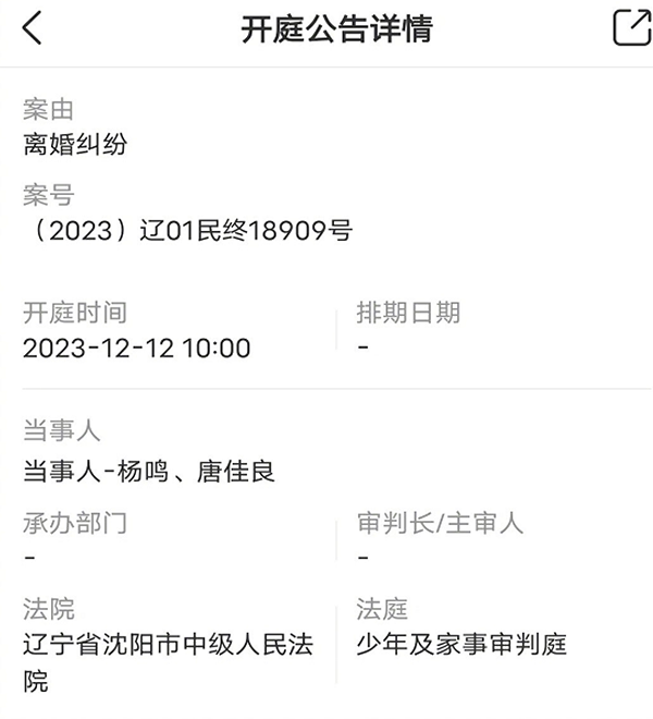 开庭在即!杨鸣唐佳良再引关注,离婚官司从区法院到市法院